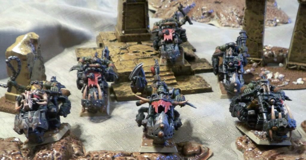 We decided on 2000pts/side, with the Orks against the Death Guard/Nurgle Guard combo at 1000pts each. I beefed up my normal 1850 list by turning the bikers into Nob Bikers, which as it turns out is an easy way to add 150pts to that list, and may well be my default way of doing so going forward, at least until I get my Killer Kans built and painted. The old nob kept his klaw and bosspole, the guy with the "surgical" mask became the Painboy, the other two guys with weapons in hand got big choppas and the remaining two were plain-jane, taking my normal 190pt biker unit to a 340pt unit of nobs.